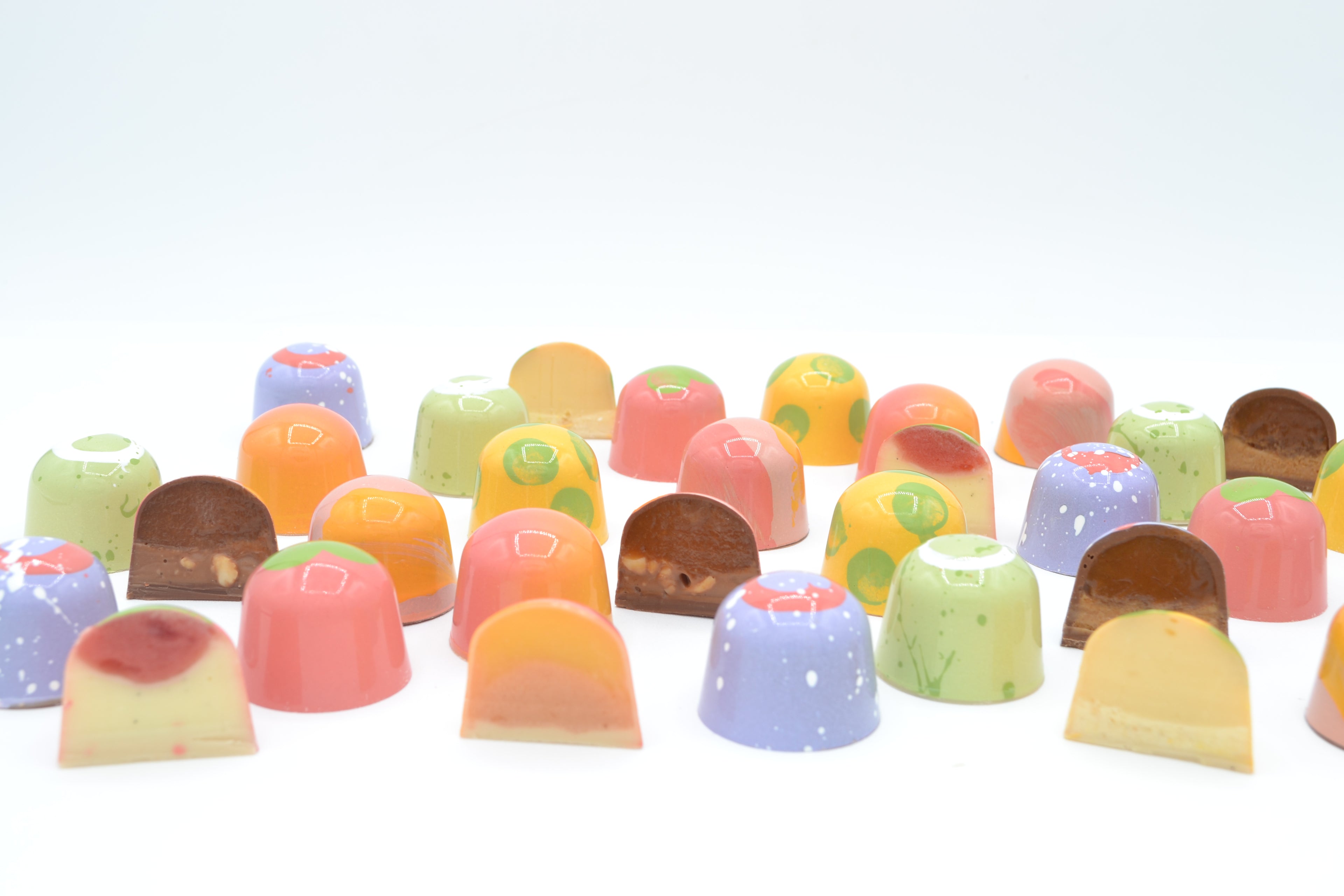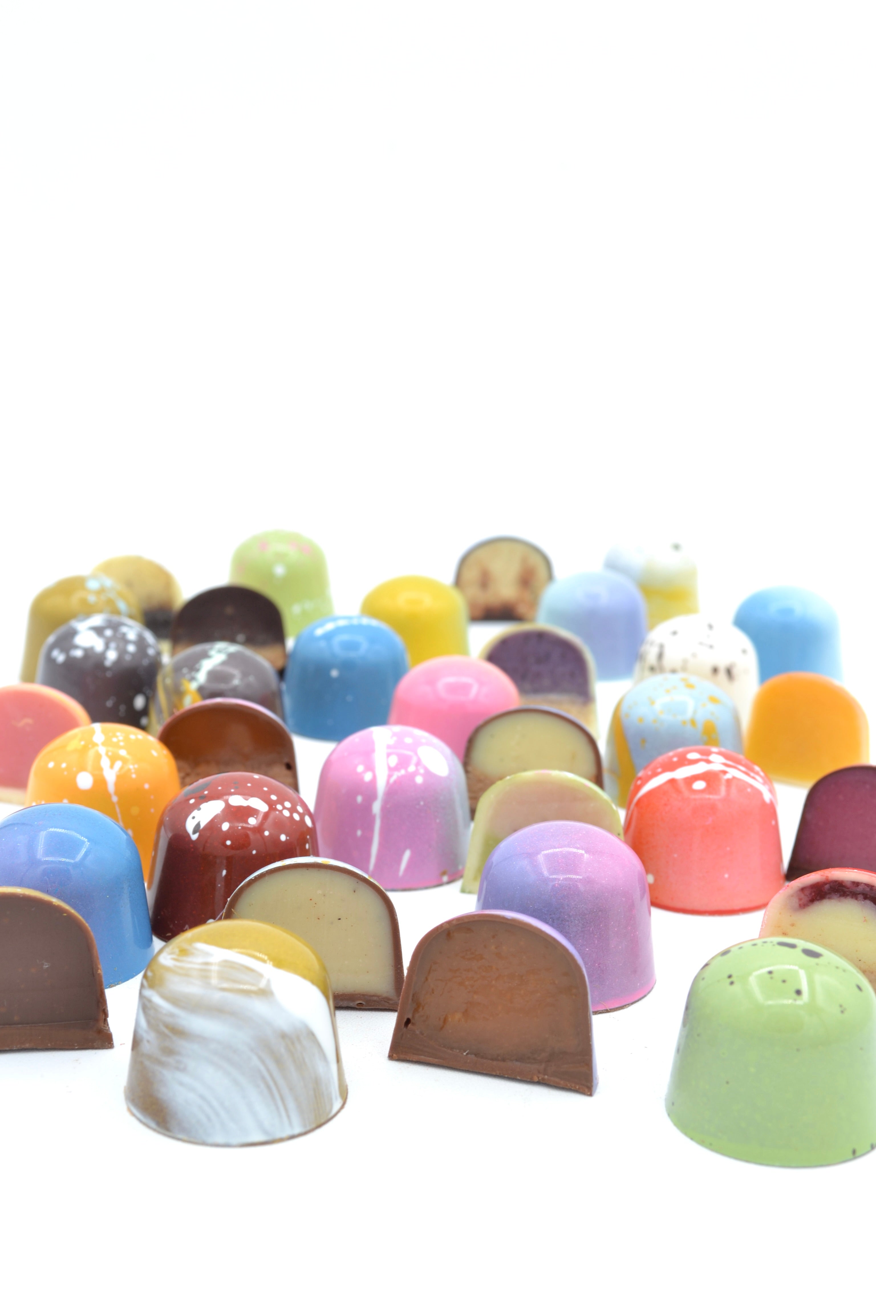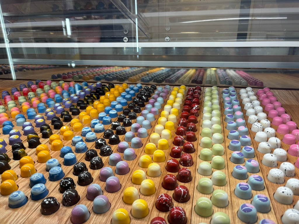 Bonbons: We are best known for our handpainted, handfilled chocolate bonbons. These delicious little treats are filled with ganaches, caramel, marshmellows, cookie layers, and much more.