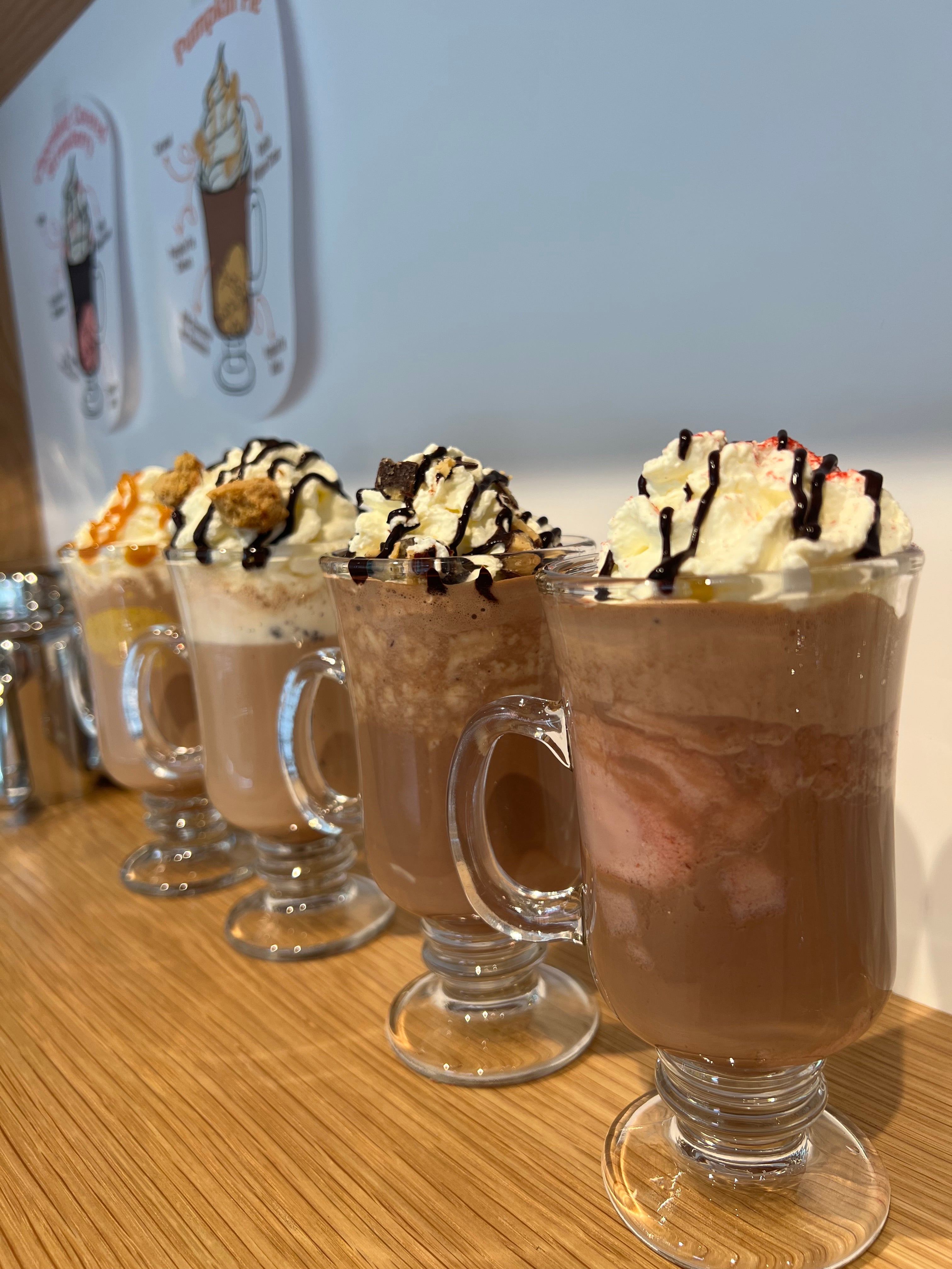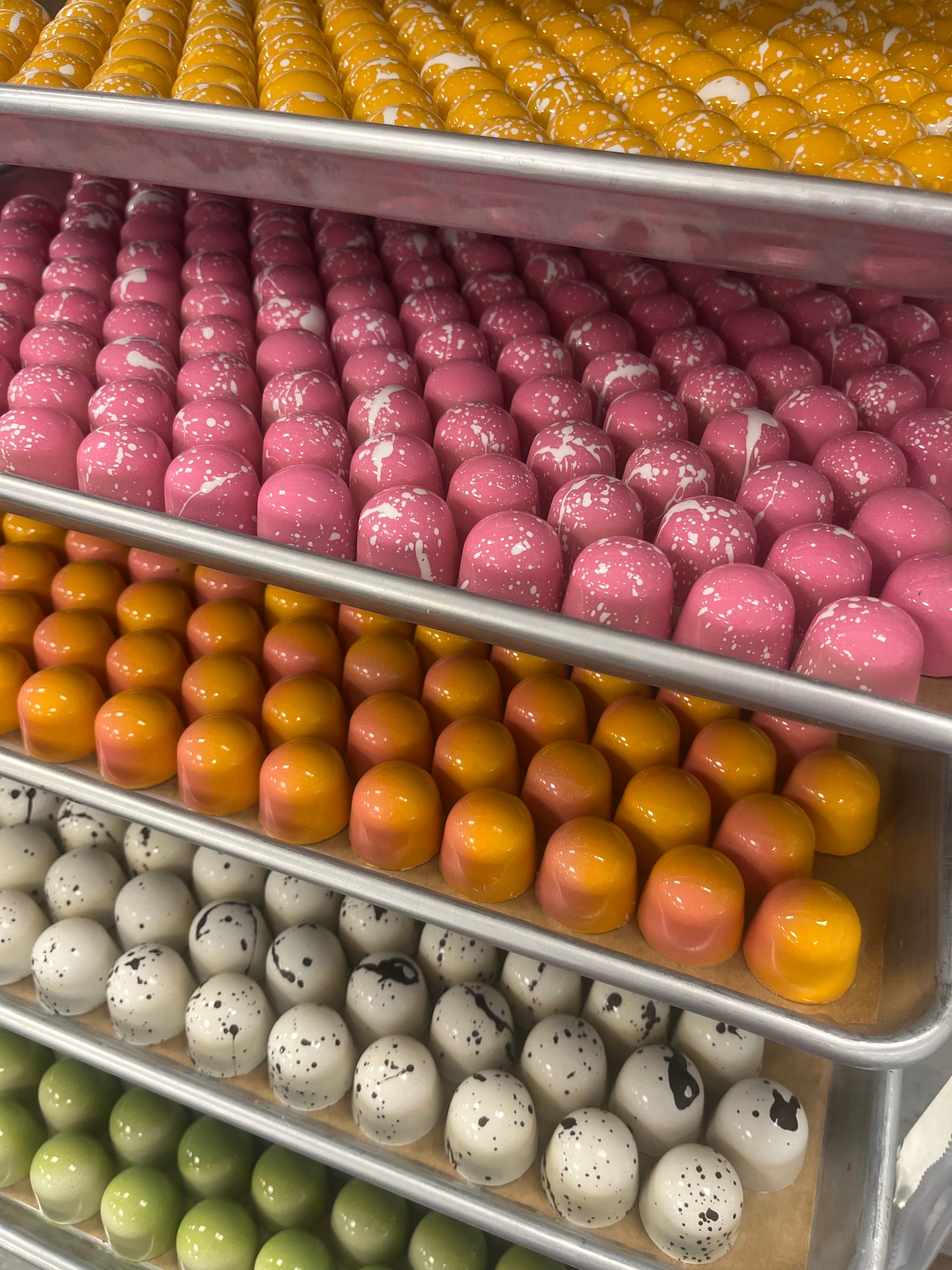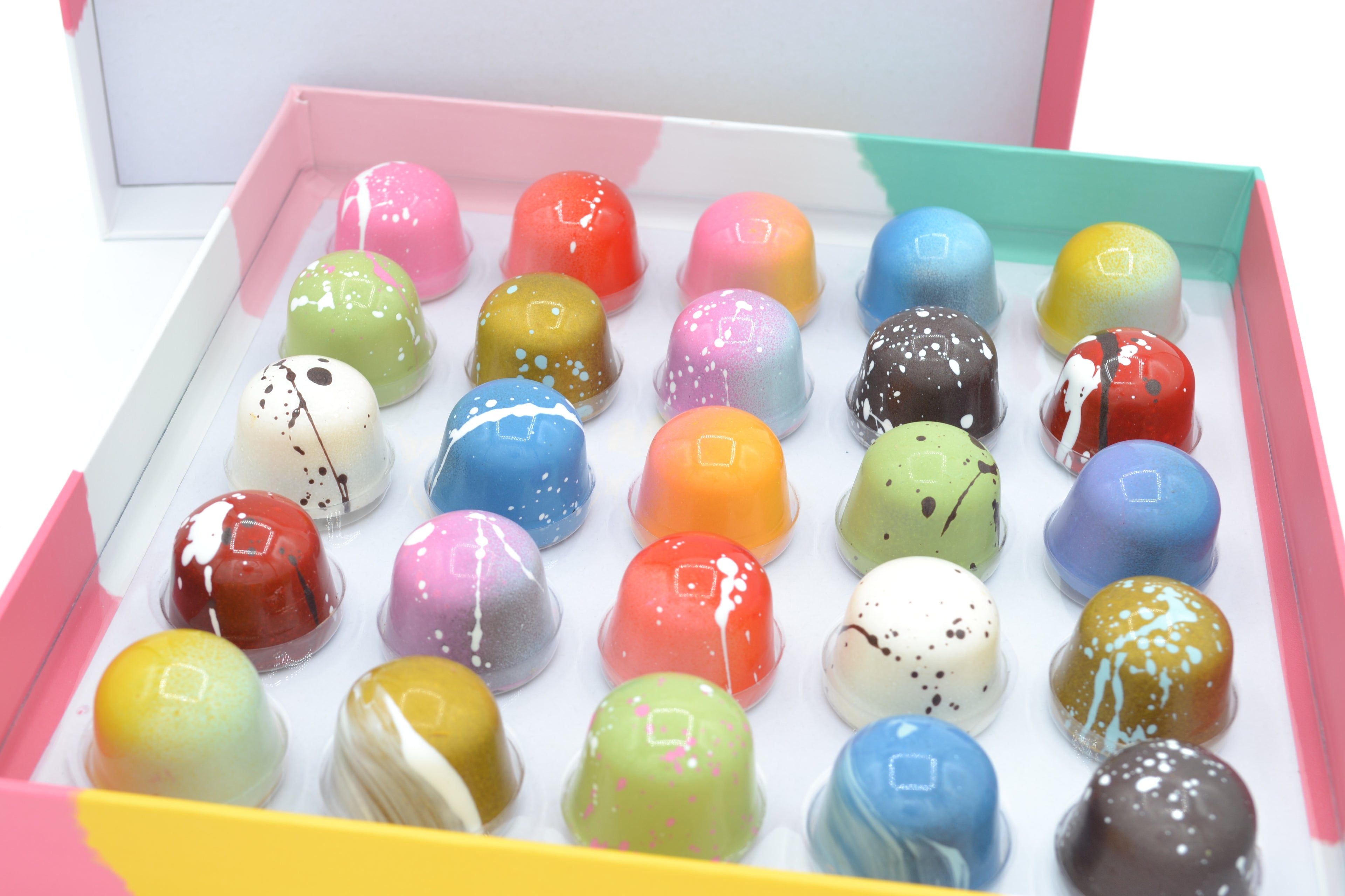 Bonbons: We are best known for our handpainted, handfilled chocolate bonbons. These delicious little treats are filled with ganaches, caramel, marshmellows, cookie layers, and much more.