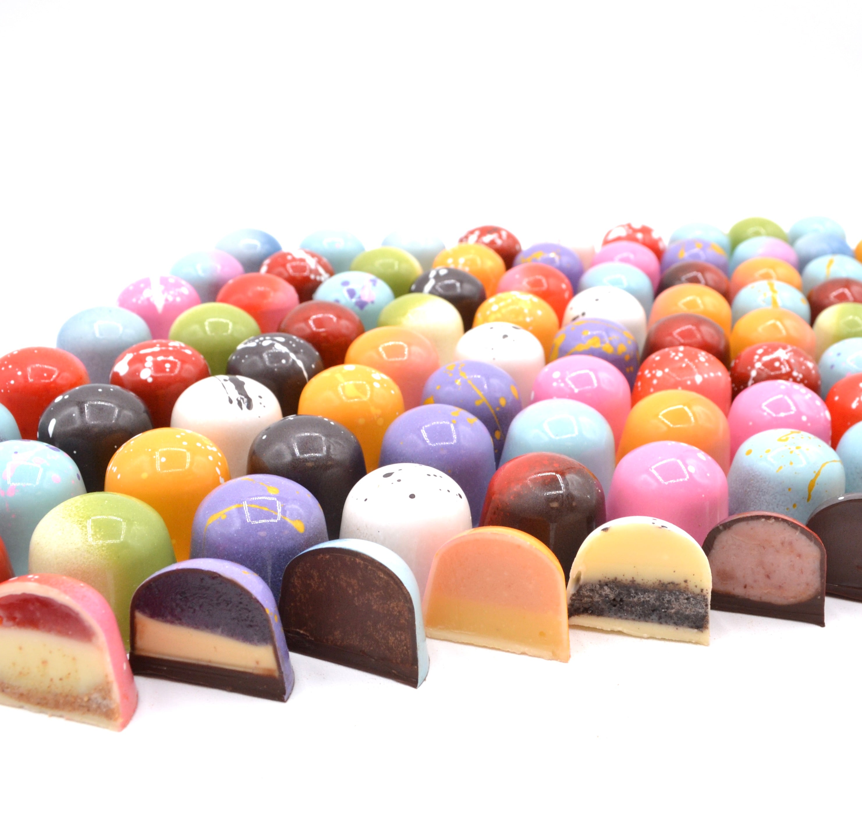 These hand made filled chocolate bonbons are edible art. Each one is filled with delicous layers flavors that are sure to delight.
