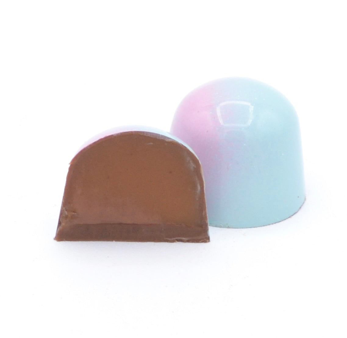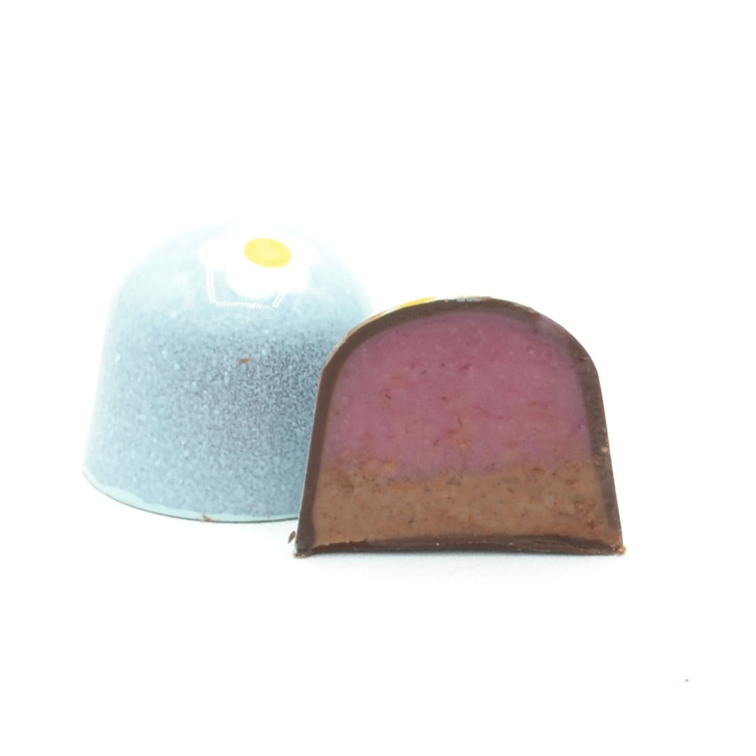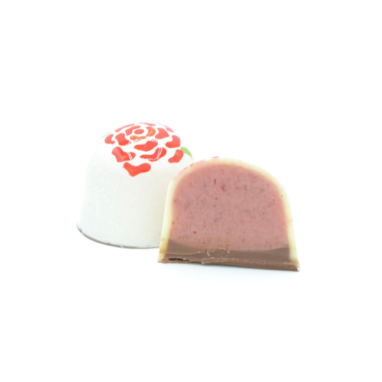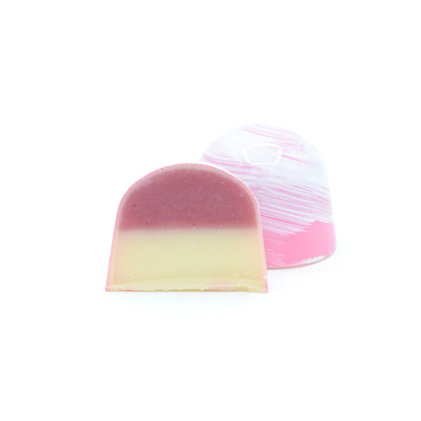 White Chocolate shell filled with a raspberry, guava and rose water filling and a milk chocolate base
