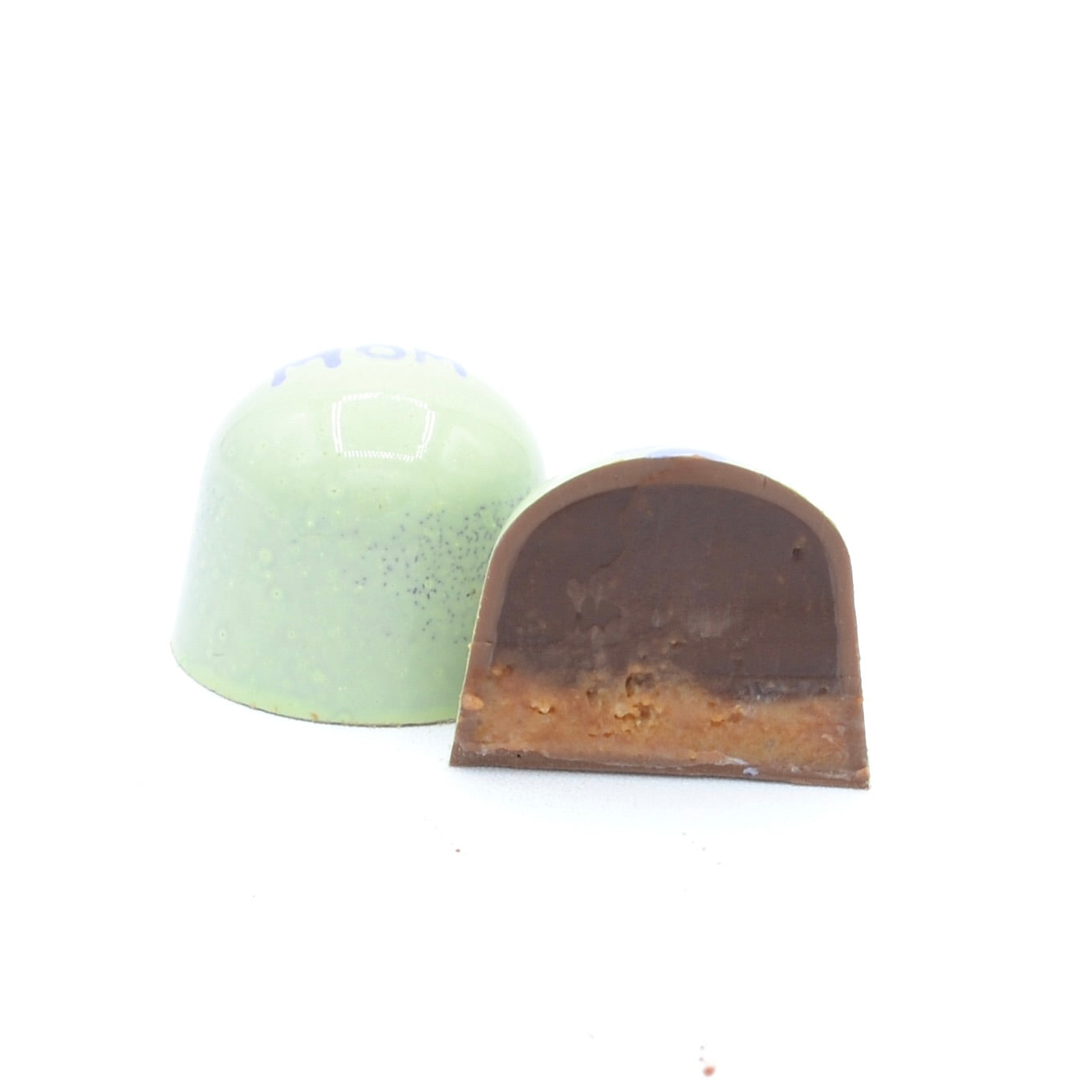 Milk chocolate shell filled with salted caramel and waffle cone crunch