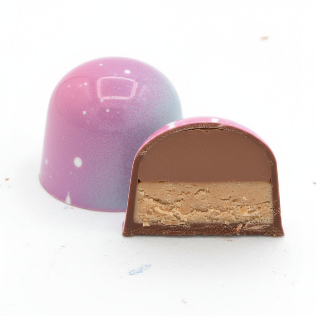 Milk chocolate shell filled with salted caramel and chocolate chip cookie crunch