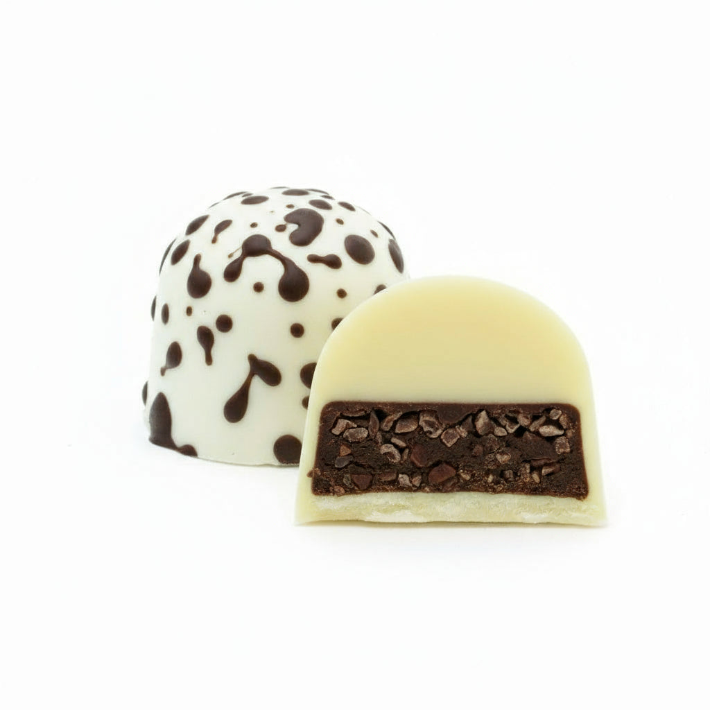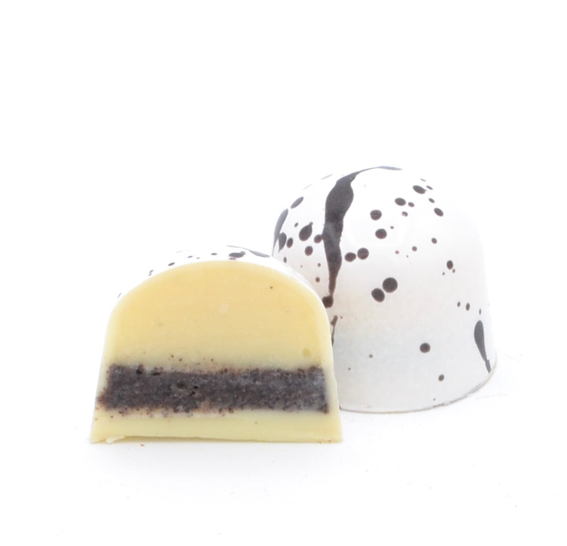 White Chocolate shell filled with white chocolate ganache and chocolate cookie crunch
