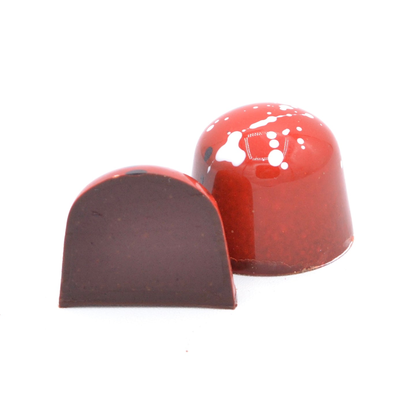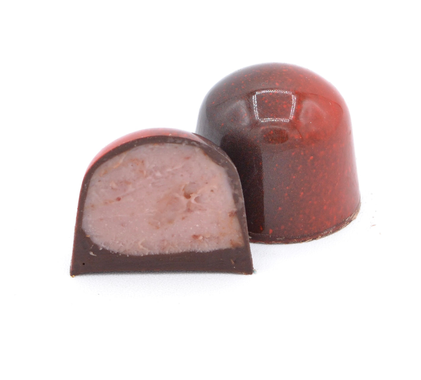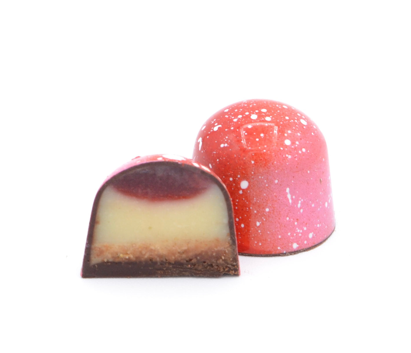 Dark chocolate shell filled with strawberry pate de fruit, cream cheese ganache and a graham cracker crunch