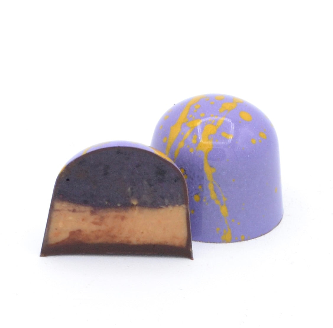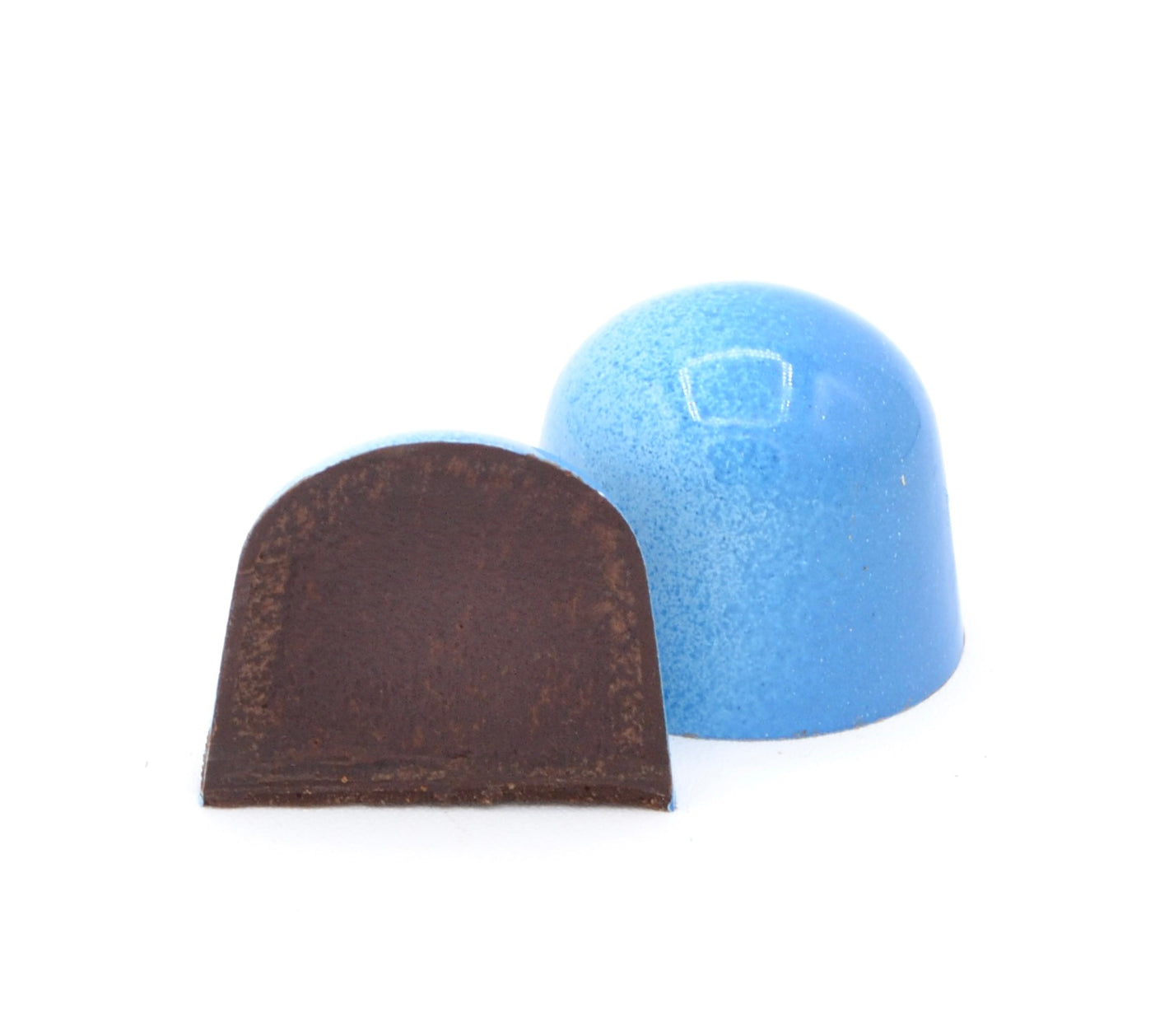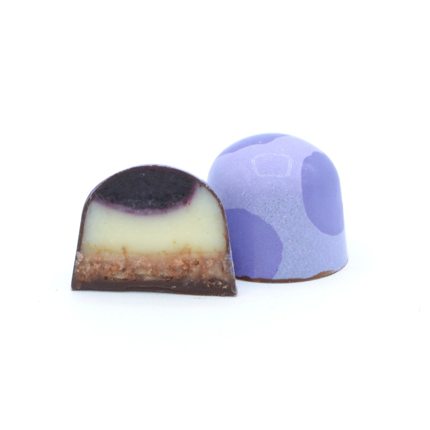 Dark chocolate shell filled with peanut praline and blueberry ganache