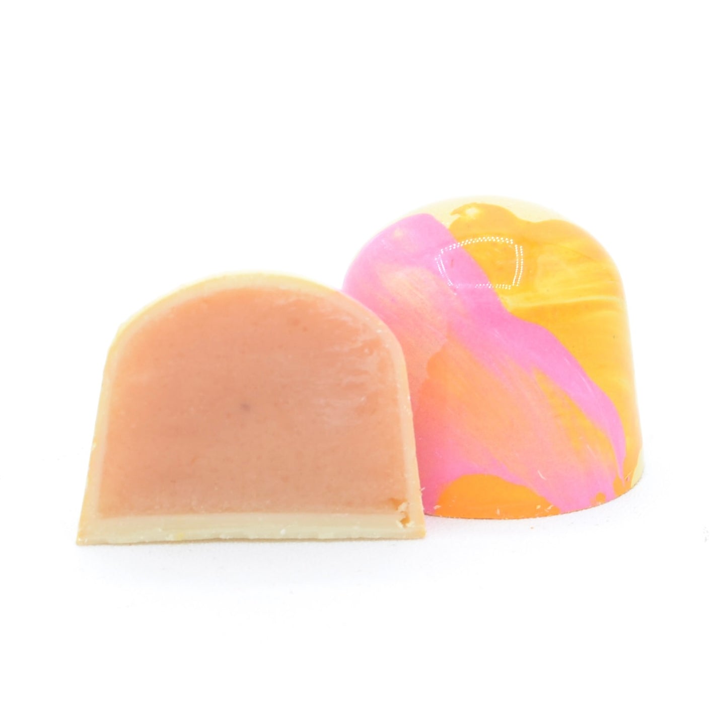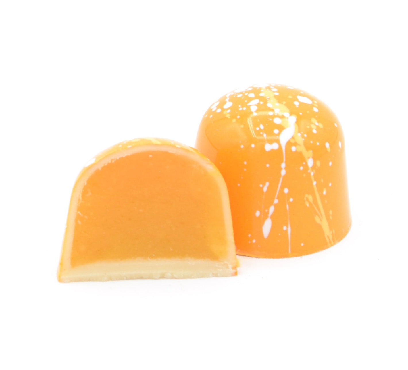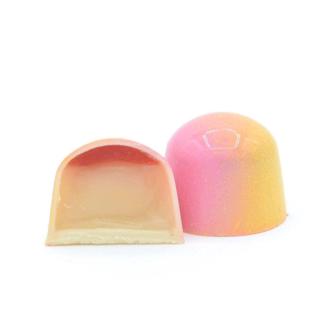 Whitte chocolate shell filled with passion fruit, guava, and blood orange caramel