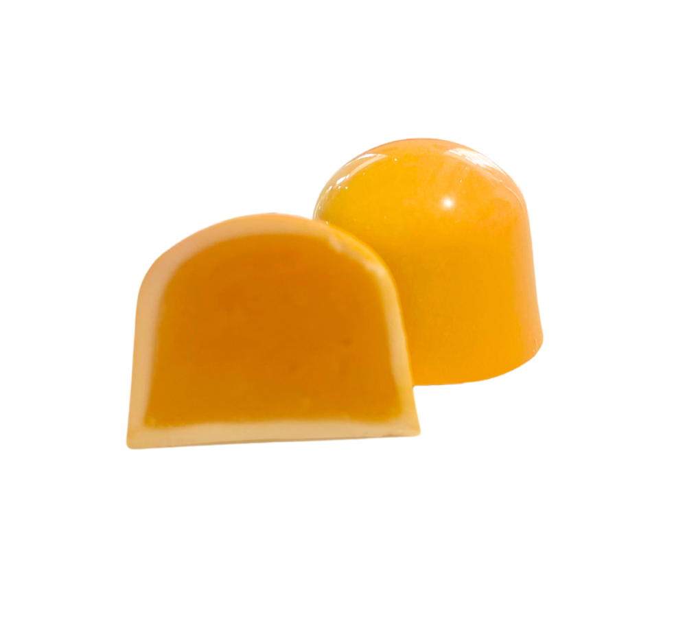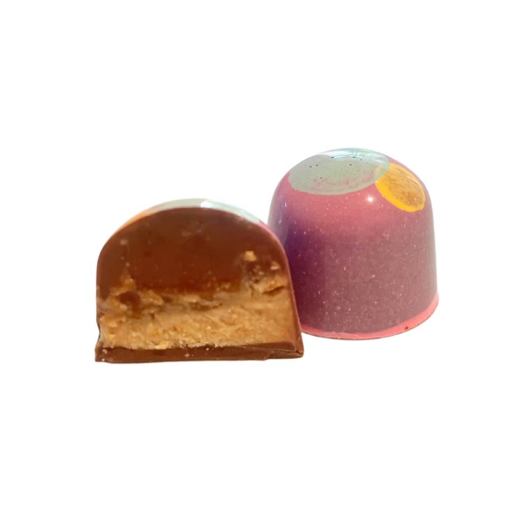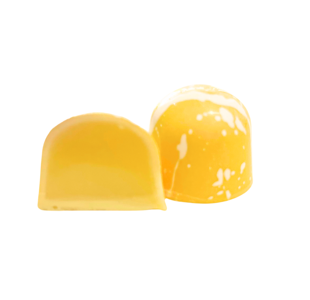 Whitte chocolate shell filled with passion fruit, guava, and blood orange caramel
