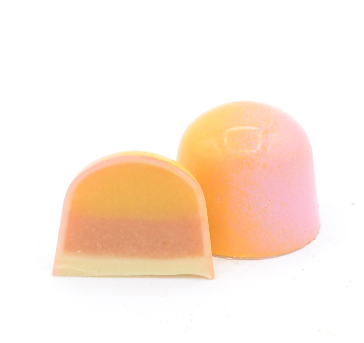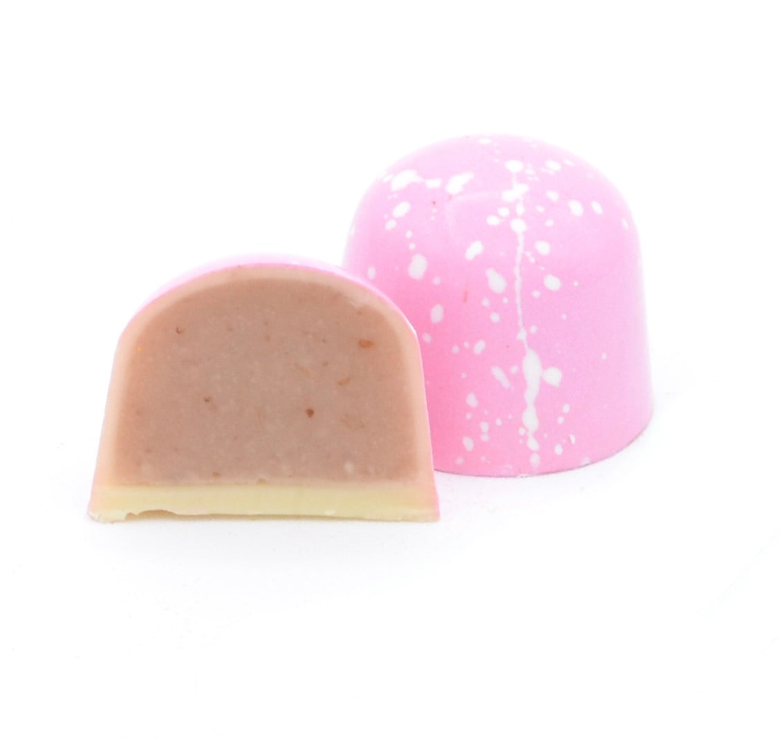 Dark chocolate shell filled with cherry pate de fruit, cream cheese ganache and a graham cracker crunch