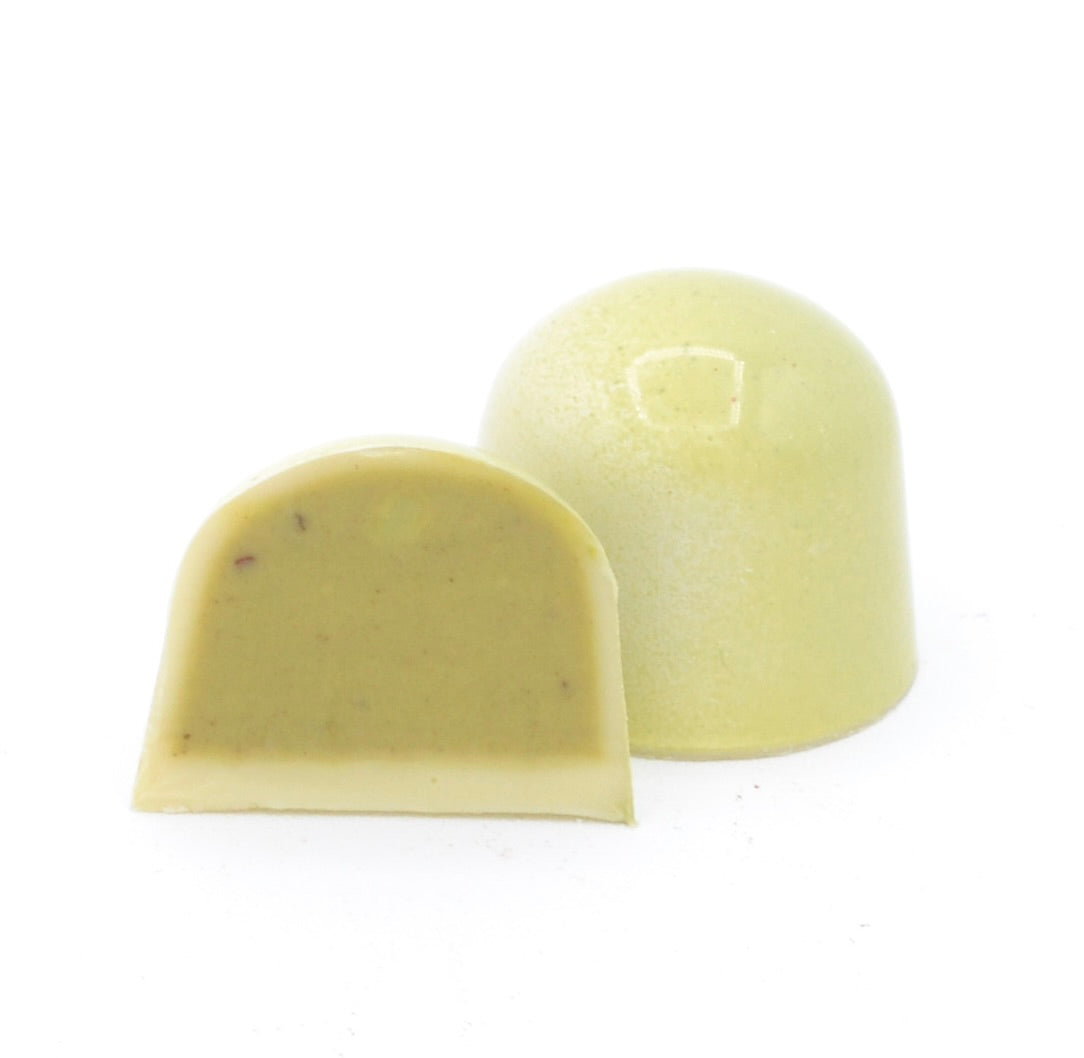White chocolate shell filled with white chocolate pistachio sea salt ganache