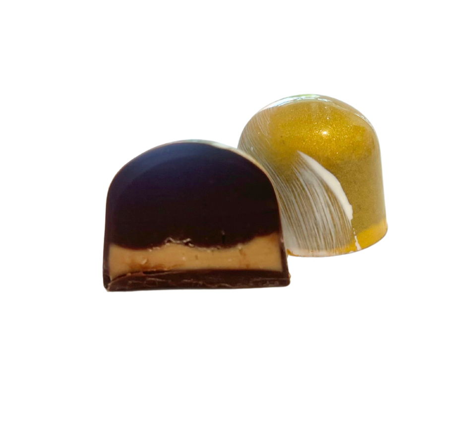 Dark Chocolate Shell filled with dark chocolate ganache and peanut praline